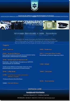 A ASPP/PSP Porto, vai realizar no próximo dia 17 de Outubro de 2011, um seminário com o tema "Actividade Profissional e Saúde Psicológica", na cidade do Porto (Auditório do Sindicato dos Professores do Norte), sito na Rua D. Manuel II , 51 C - 3.º (Edificio Cristal Park), junto ao Hospital de Santo António.